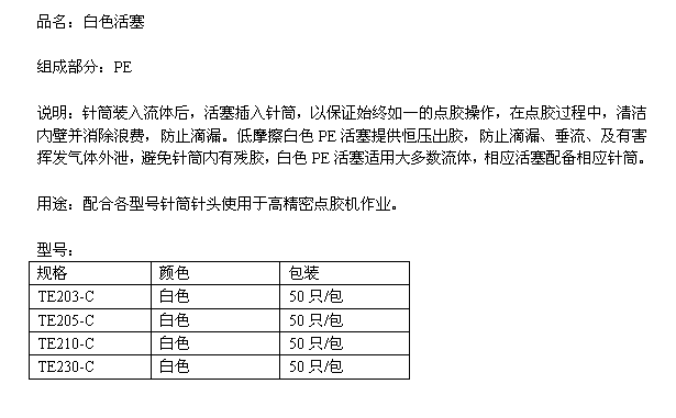 针筒装入流体后,活塞插入针筒,以保证始终如一的点胶操作,在点胶过程中,清洁内壁并消除浪费,防止滴漏。低摩擦白色PE活塞提供恒压出胶,防止滴漏、垂流、及有害挥发气体外泄,避免针筒内有残胶,白色PE活塞适用大多数流体,相应活塞配备相应针筒。